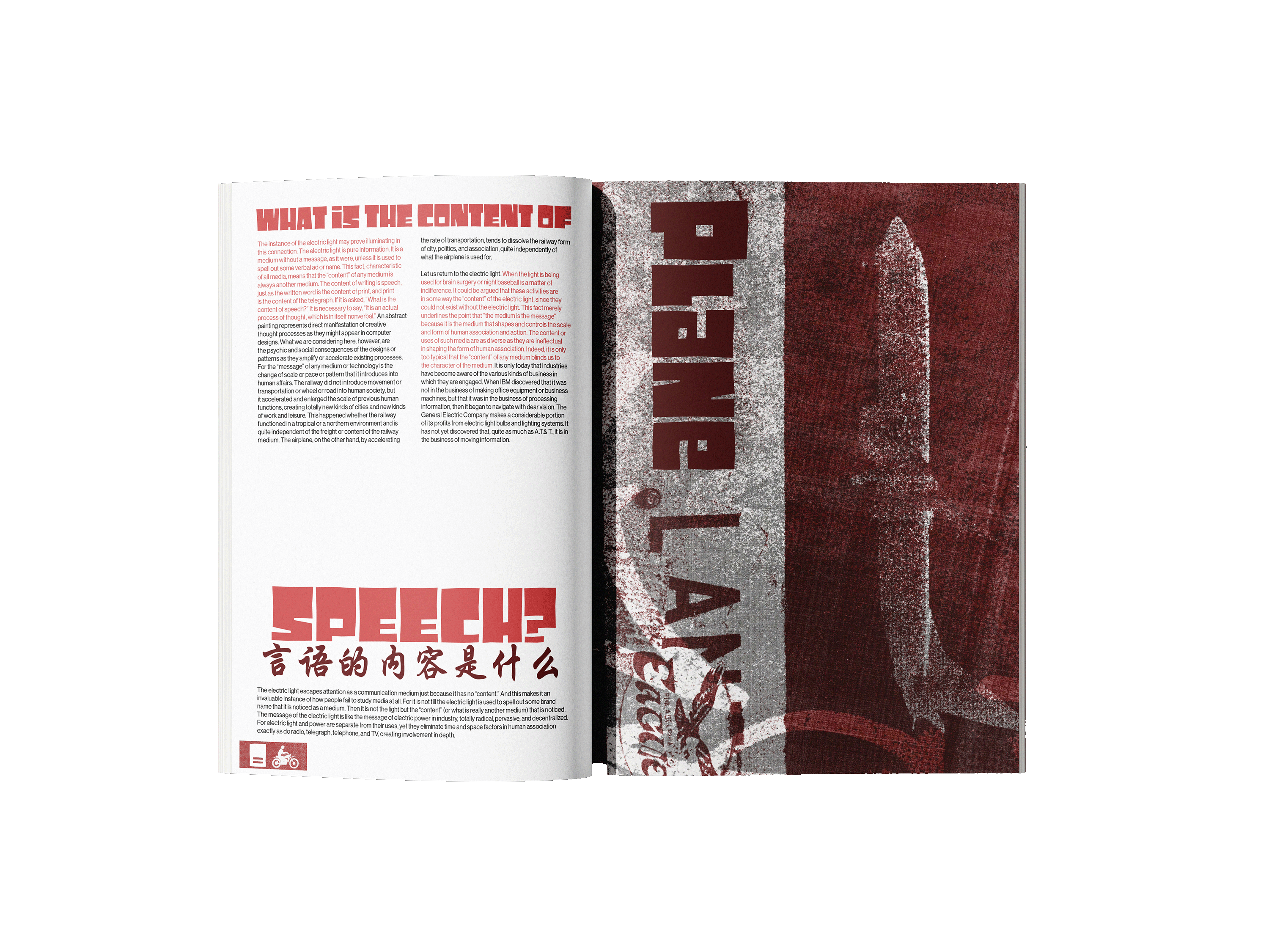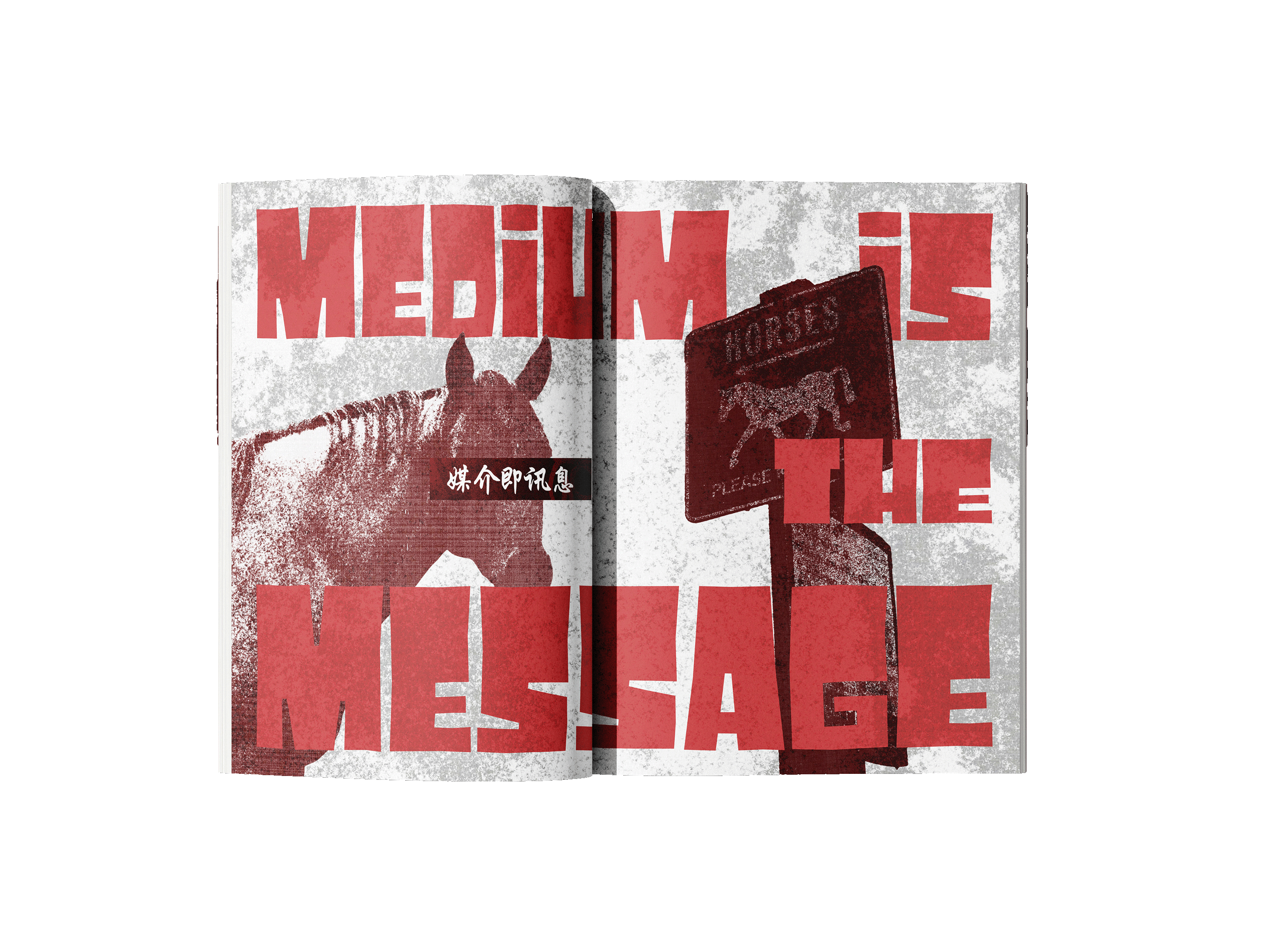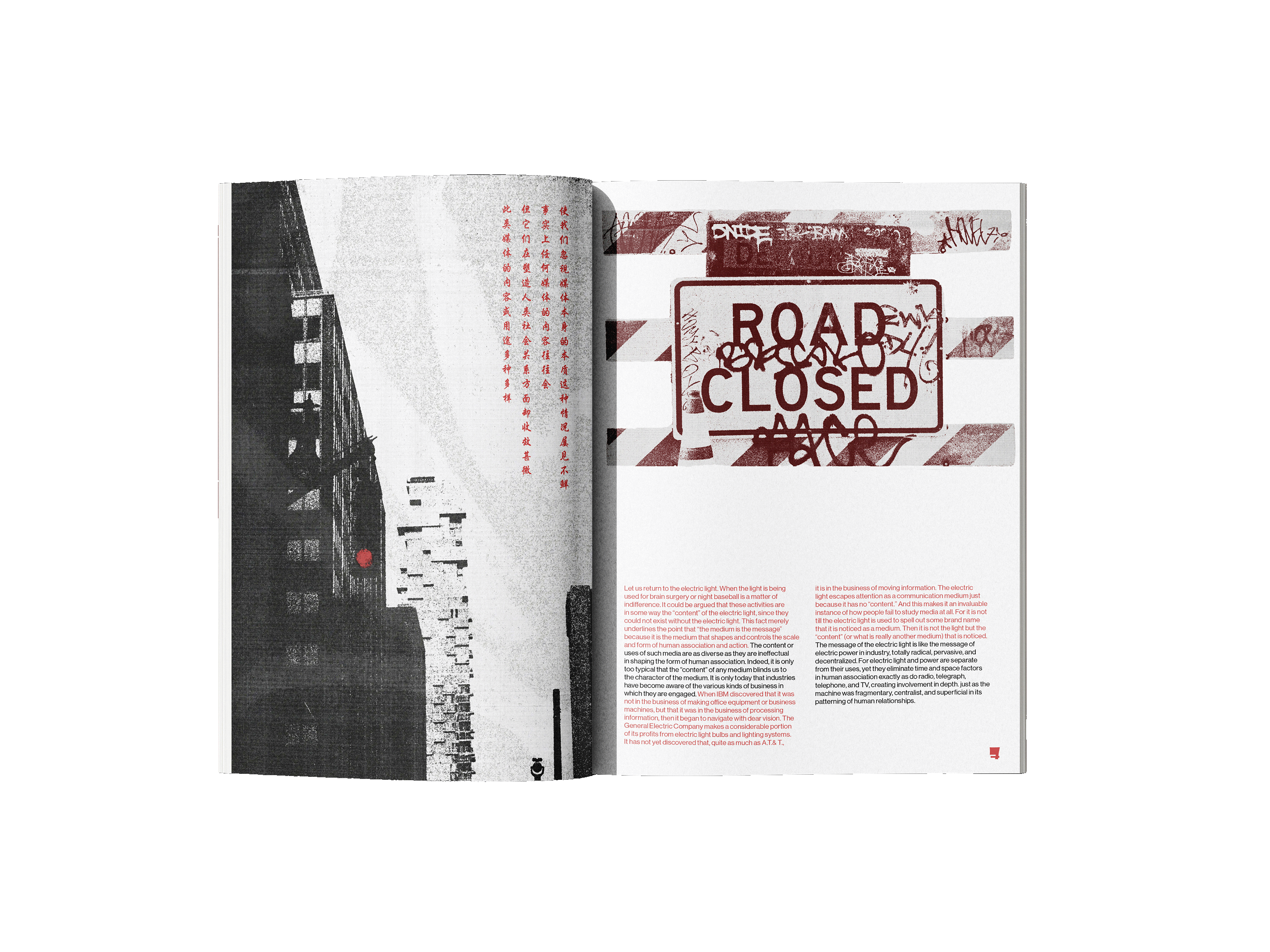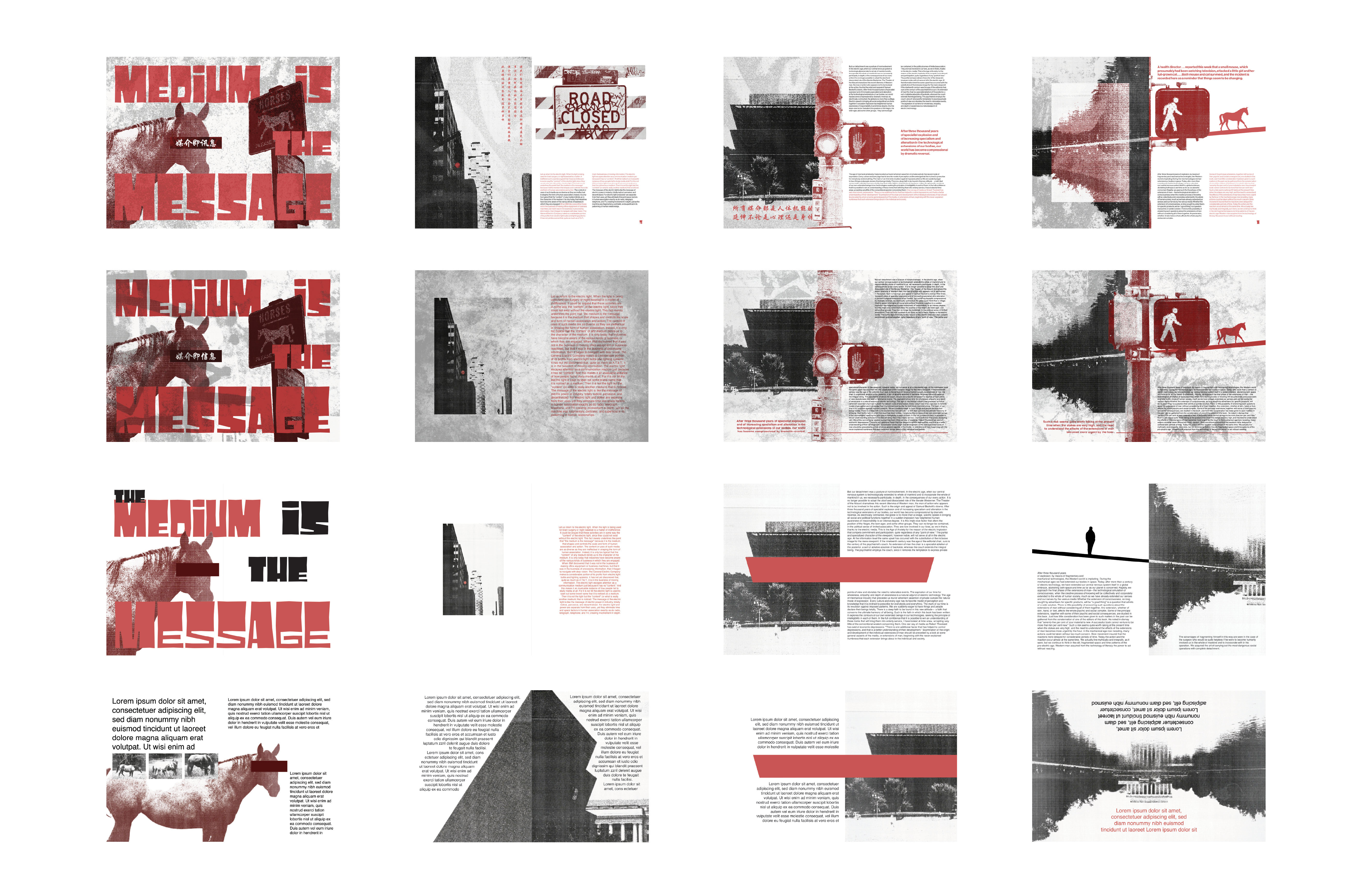 The book explores how media and technology act as extensions of human senses and abilities, shaping how people think, communicate, and experience the world. The quote “the medium is the message,” means the form of a medium influences society more than its content. Inspired by this concept, I explored how different mediums convey language and communication. By incorporating street signs and languages other than English, I designed a street art inspired book that visually shouts at the reader. The use of red emphasizes power and importance compared just as a stop sign or traffic light silently commands attention, these visual cues convey messages that are quiet yet impossible to ignore.