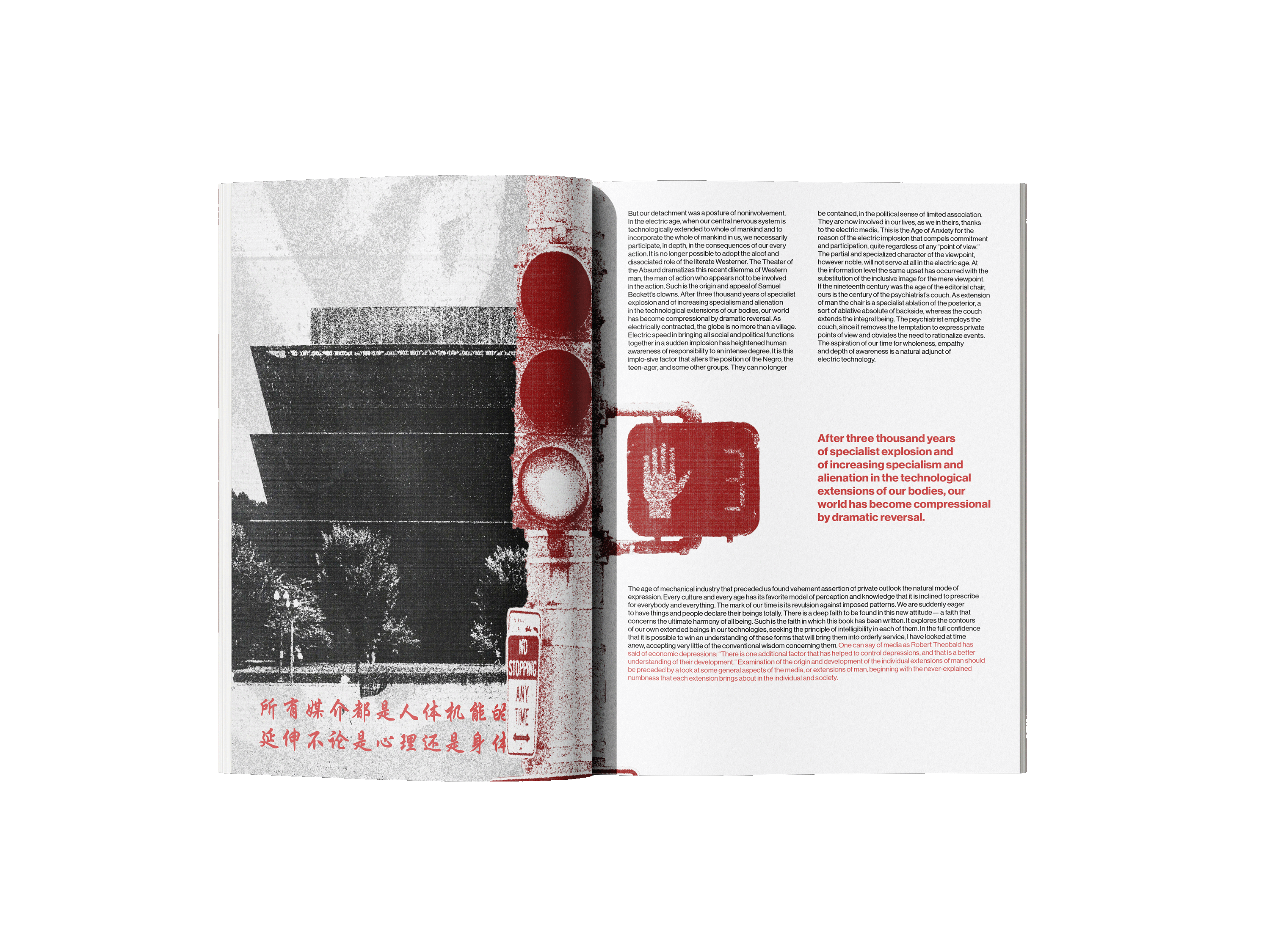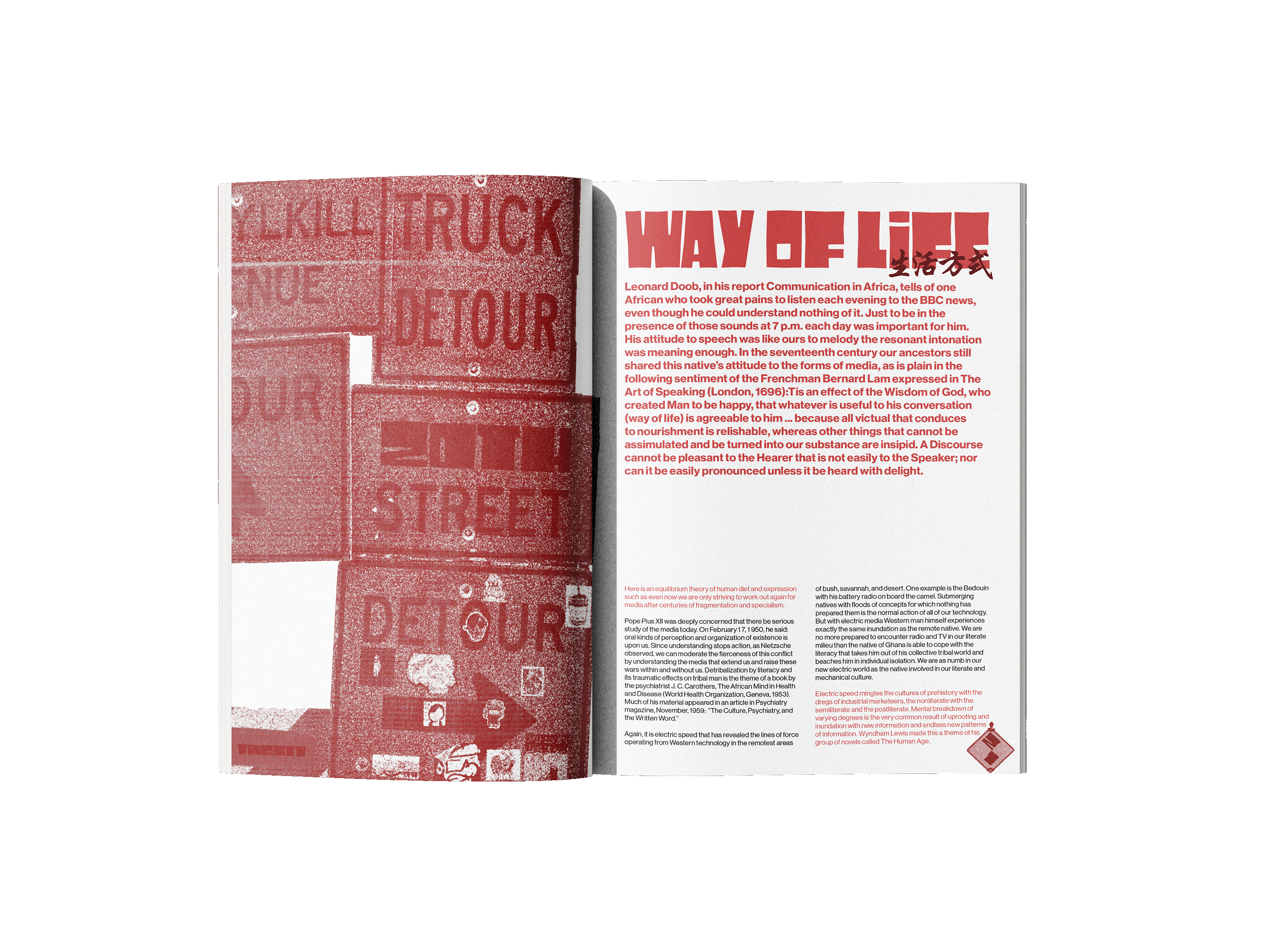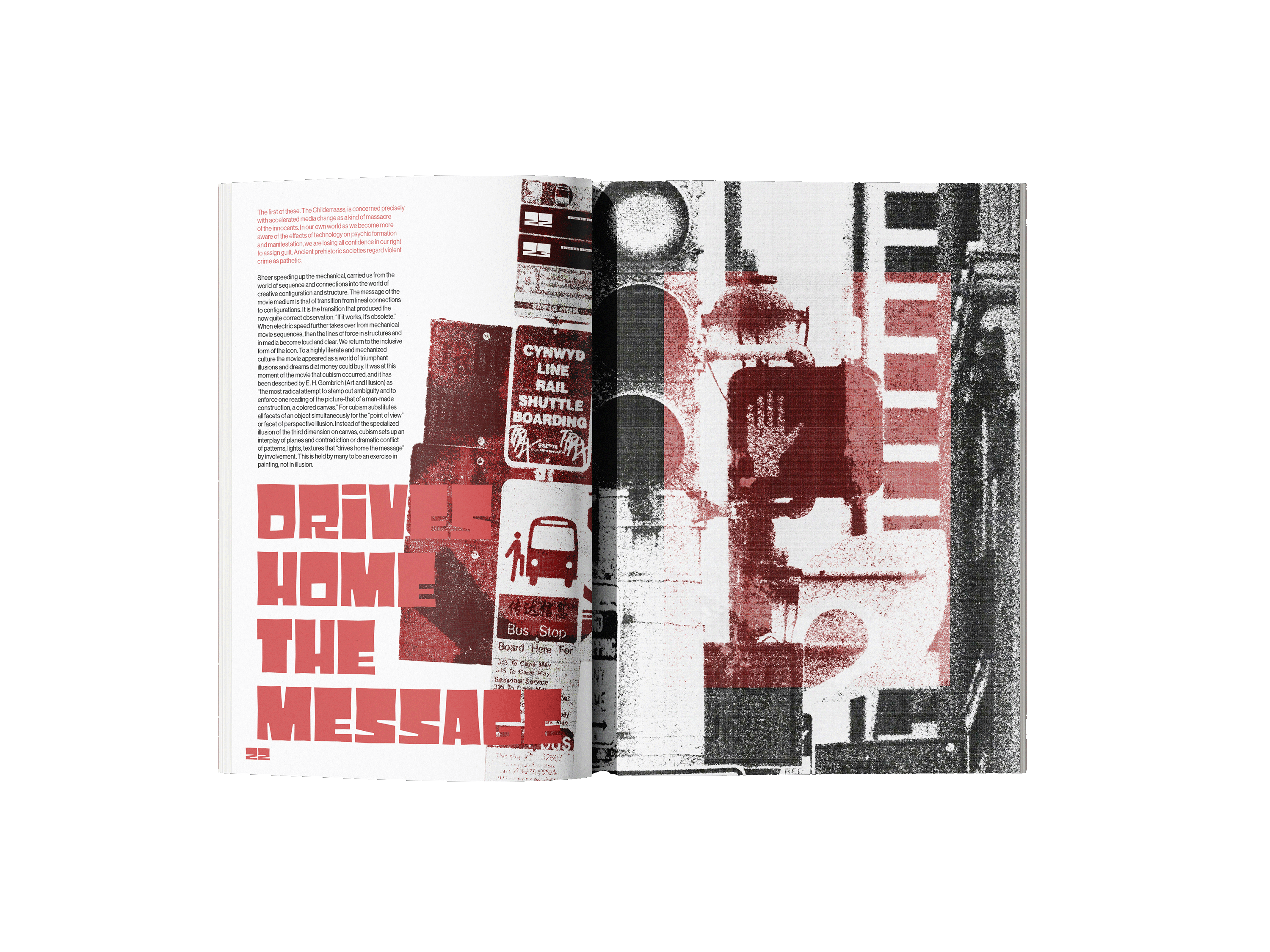 The book explores how media and technology act as extensions of human senses and abilities, shaping how people think, communicate, and experience the world. The quote “the medium is the message,” means the form of a medium influences society more than its content. Inspired by this concept, I explored how different mediums convey language and communication. By incorporating street signs and languages other than English, I designed a street art inspired book that visually shouts at the reader. The use of red emphasizes power and importance compared just as a stop sign or traffic light silently commands attention, these visual cues convey messages that are quiet yet impossible to ignore.