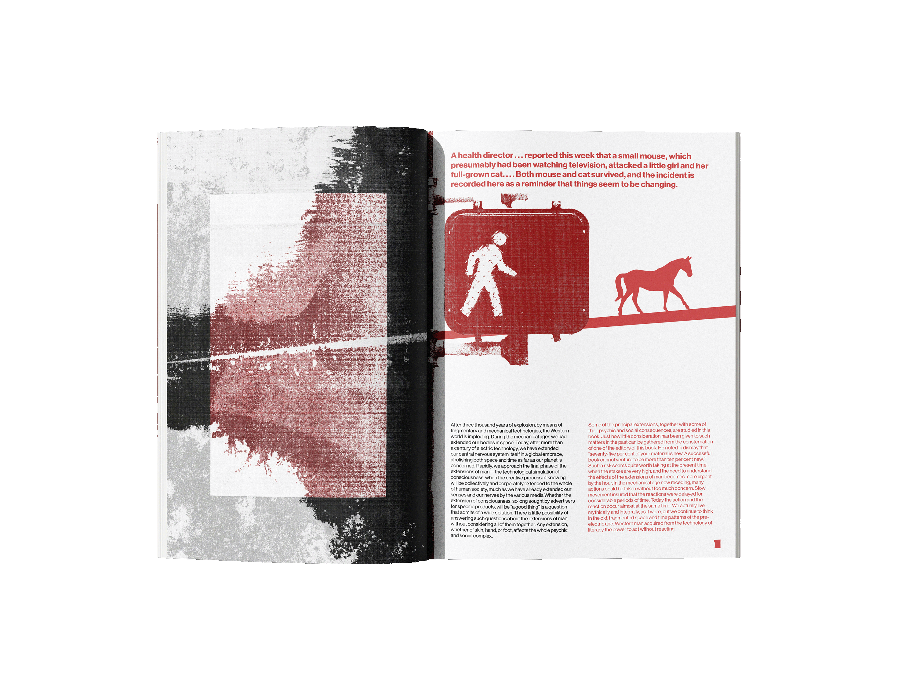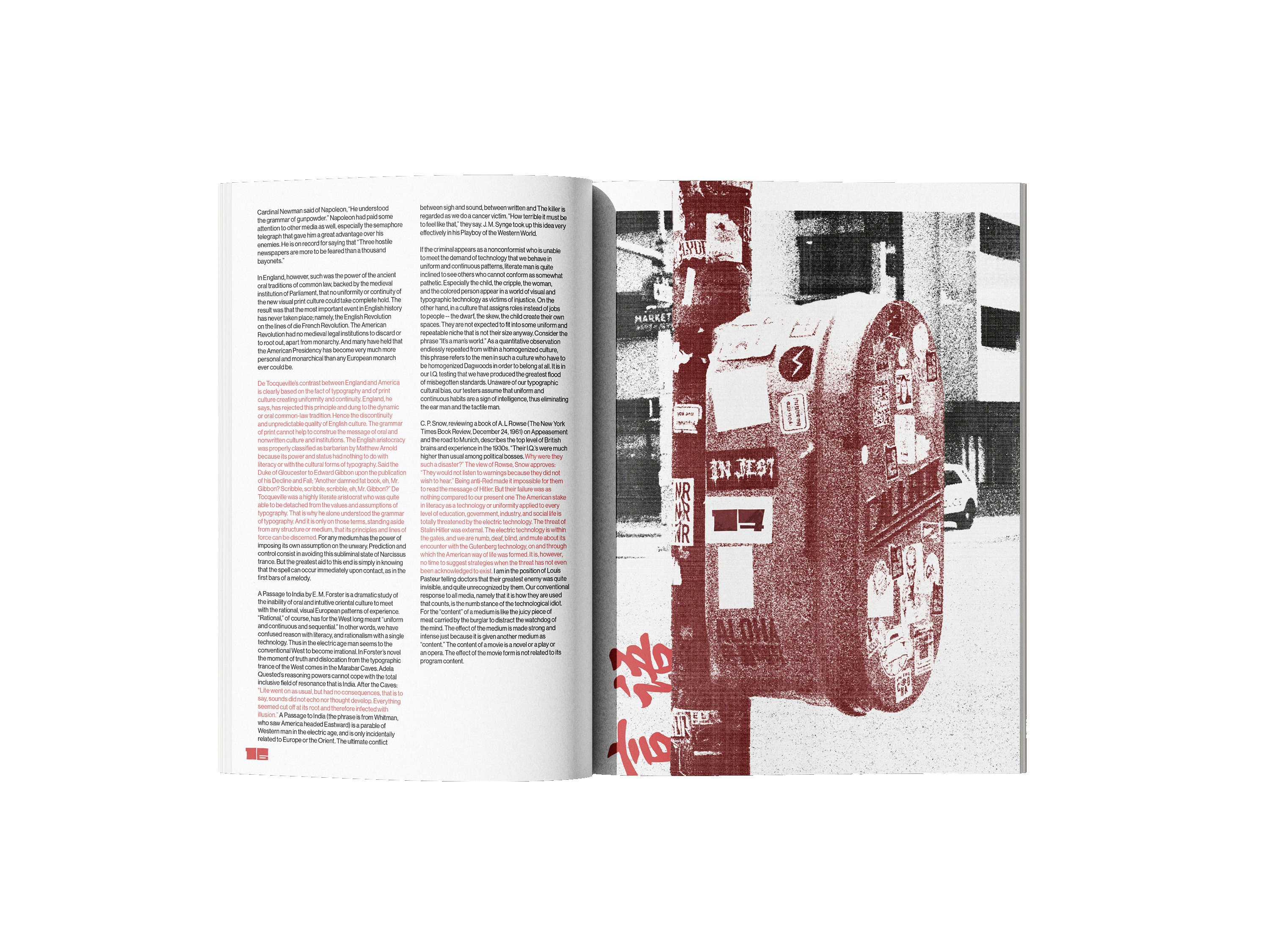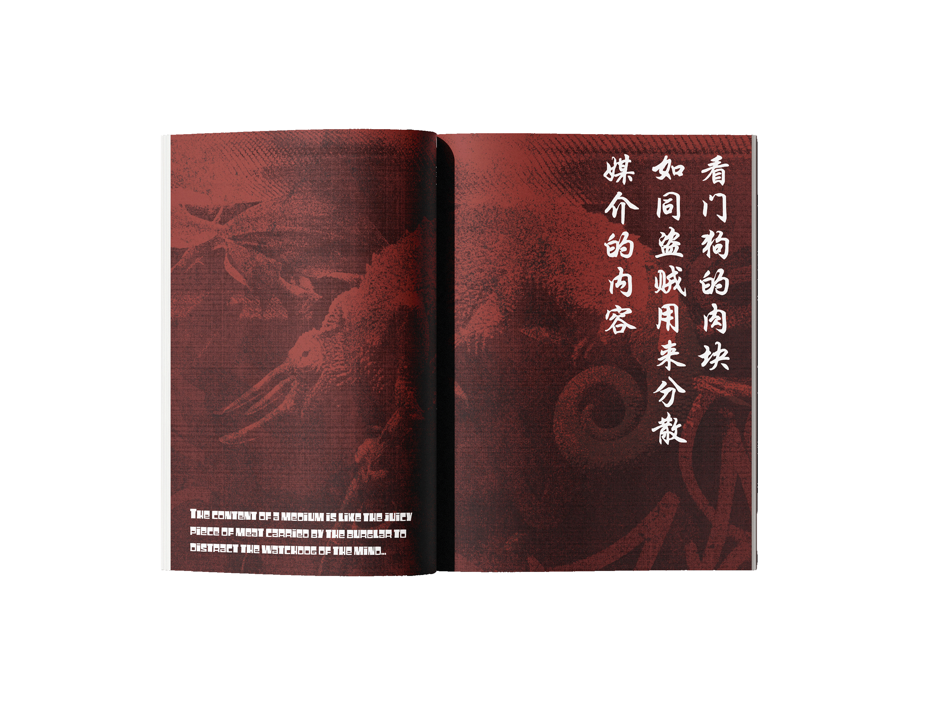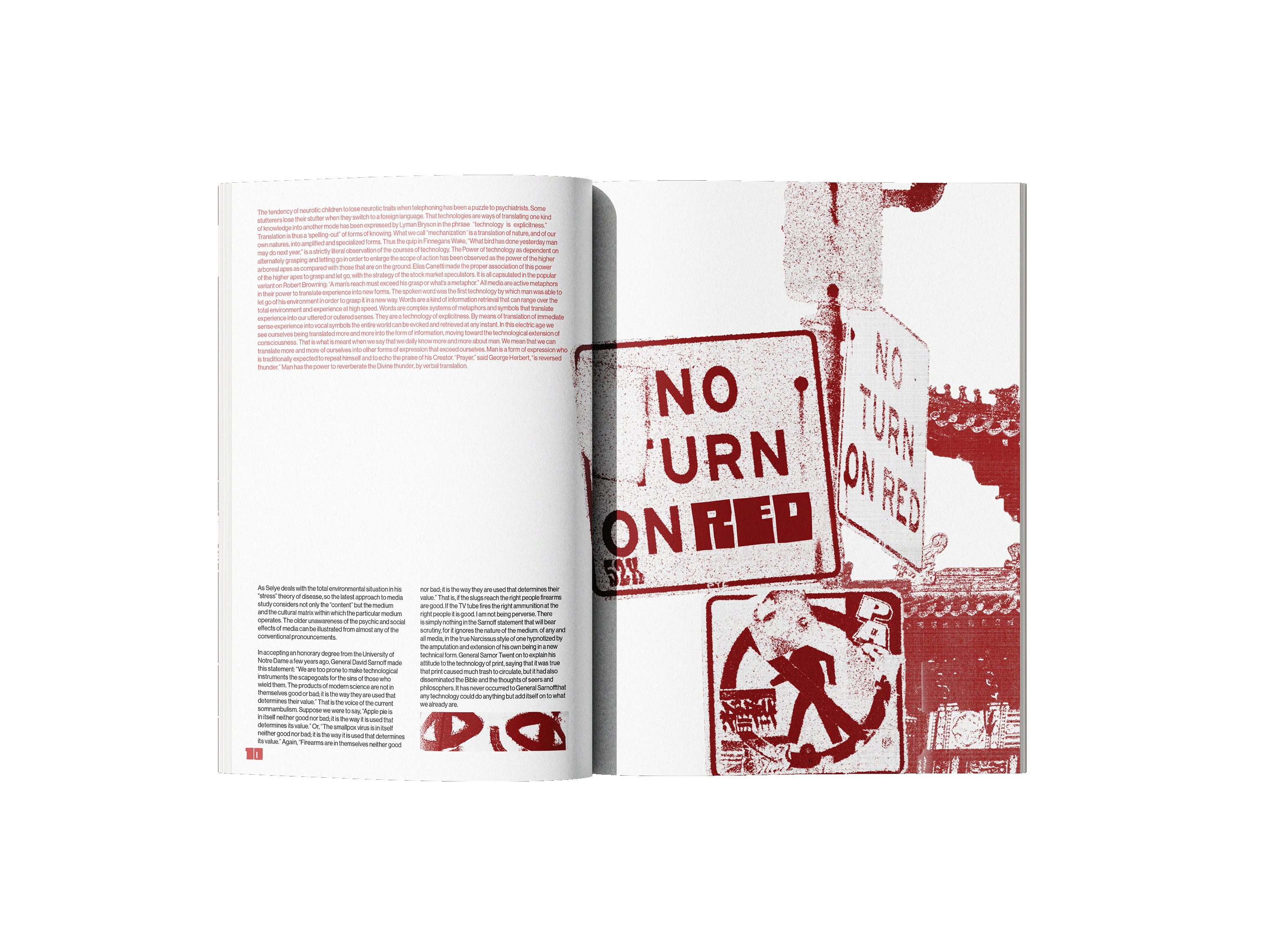 The book explores how media and technology act as extensions of human senses and abilities, shaping how people think, communicate, and experience the world. The quote “the medium is the message,” means the form of a medium influences society more than its content. Inspired by this concept, I explored how different mediums convey language and communication. By incorporating street signs and languages other than English, I designed a street art inspired book that visually shouts at the reader. The use of red emphasizes power and importance compared just as a stop sign or traffic light silently commands attention, these visual cues convey messages that are quiet yet impossible to ignore.